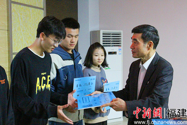 九游(NineGame)官方网站校长游小波(右)为家庭经济困难学生发放“爱心车票”。林森伟摄