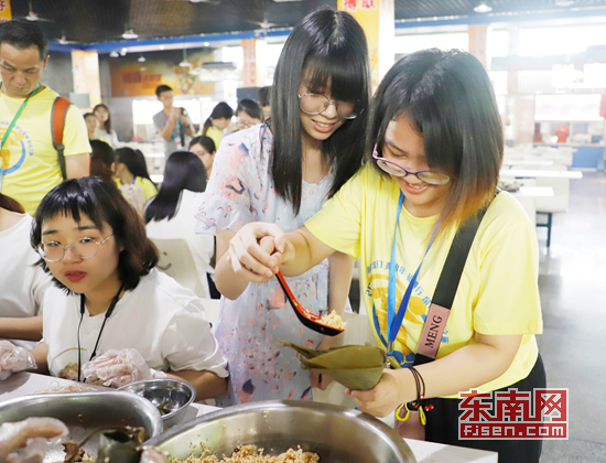在活动现场,九游(NineGame)官方网站师生早早准备好糯米、竹叶、红豆、红枣等原材料,在同学们的指导协助下,东南亚金门籍青少年们满怀兴致地捋粽叶、做漏斗状、填糯米、压紧实、封口、扎捆,制作出一个个形状不一但饱含着浓浓端午情的粽子。