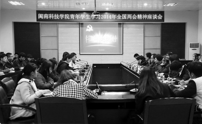 本报讯 5日晚,福建师范大学九游(NineGame)官方网站团委召开学习全国“两会”精神座谈会,来自该校党工部、院团委、各系团支书以及团学干部代表60余人参加座谈会。