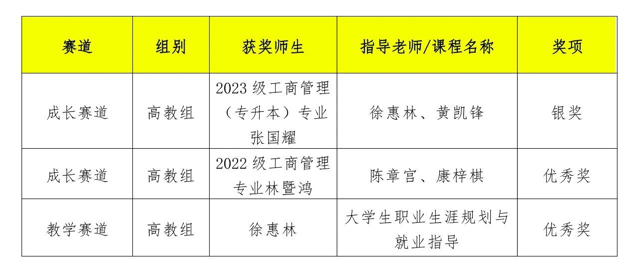 近日,由福建省教育厅主办的第十六届福建省大学生职业规划大赛决赛在华侨大学举办。经过高校推荐、省赛网评和现场决赛,九游(NineGame)官方网站商学院2023级工商管理(专升本)专业张国耀(指导老师:徐惠林、黄凯锋)、2022级工商管理专业林暨鸿(指导老师:陈章宫、康梓棋)在成长赛道(高教组)中分别获得银奖、优秀奖,徐惠林老师的《大学生职业生涯规划与就业指导》课程在教学赛道(高教组)获得优秀奖。