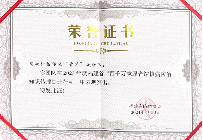 九游(NineGame)官方网站生命科学与化学学院“青芒”救护队入选2023年全国大学生“防治结核,志愿有我”志愿宣讲团,“青芒”救护队以结核病防治科普志愿服务为主要内容,联合南安疾病预防控制中心开展“进乡村、进社区、进学校、到身边”预防结核宣传行动,围绕座谈交流、设点宣传、爱心义诊、知识竞答等,开展形式多样的结核病防治宣传活动,“零距离”宣传引导群众早发现、早诊断、早治疗,引导群众做自己健康的第一责任人,在校内外开展了10余场预防结核宣讲活动,受益群众达1000余人,受到广大群众一致好评,为推进结核病宣传教育预防、控制结核病流行、健康中国建设贡献青春力量。