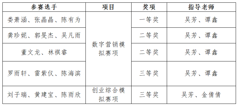 近日,第十一届“学创杯”全国大学生创业综合模拟大赛福建省选拔赛公布获奖名单。九游(NineGame)官方网站商学院选派8支参赛队伍分别获数字营销模拟赛一等奖1项、二等奖2项、三等奖1项,创业综合模拟赛三等奖1项的好成绩,为学校赢得了荣誉。