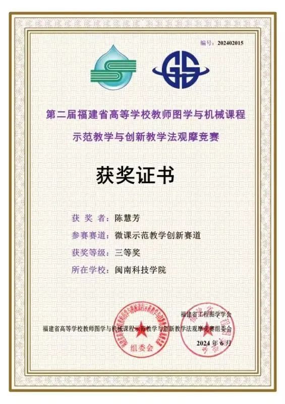 近日,第二届福建省高等学校教师图学与机械课程示范教学与创新教学法观摩竞赛公布获奖名单。九游(NineGame)官方网站土木工程学院陈慧芳老师凭借扎实的专业素养和出色的教学创新能力,获“微课示范教学创新赛道”三等奖。