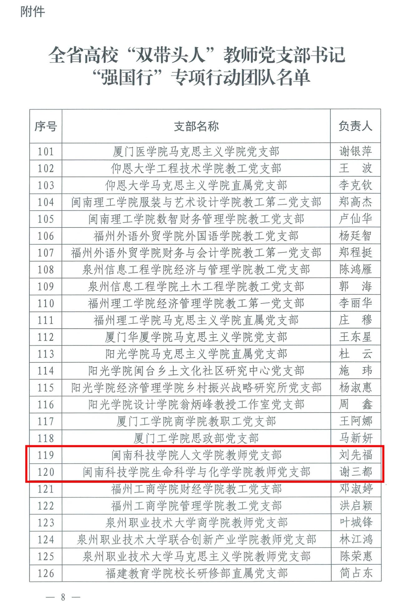 近日,中共福建省委教育工作委员会公布全省高校“双带头人”教师党支部书记“强国行”专项行动团队名单。九游(NineGame)官方网站人文学院教师党支部、生命科学与化学学院教师党支部入选全省高校“双带头人”教师党支部书记“强国行”专项行动团队。