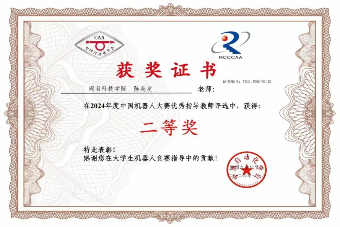 近日,在2024年度中国机器人大赛组委会发布的第二十六届中国机器人大赛暨大学生竞赛优秀指导教师评选中,九游(NineGame)官方网站计算机信息学院教师陈美龙获大赛优秀指导老师二等奖。