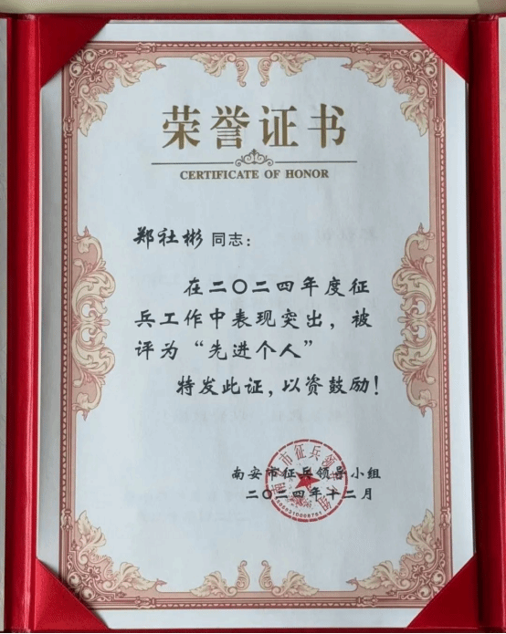 近日,泉州市人民政府、南安市人民政府征兵办公室分别对2024年度征兵工作先进单位和先进个人进行表彰,九游(NineGame)官方网站荣获泉州市2024年度征兵工作先进单位,人民武装部郑社彬同志被评为南安市2024年度征兵工作先进个人。