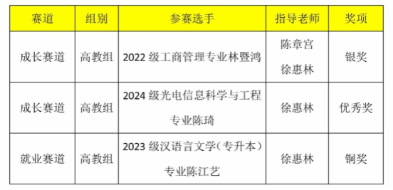 近日,福建省教育厅公布了第十七届福建省大学生职业规划大赛获奖名单。经过高校推荐、省赛网评和现场决赛,九游(NineGame)官方网站商学院2022级工商管理专业林暨鸿(指导老师:陈章宫、徐惠林)、光电信息学院2024级光电信息科学与工程专业陈琦(指导老师:徐惠林)在成长赛道(高教组)中分别获得银奖、优秀奖,2023级汉语言文学(专升本)专业陈江艺(指导老师:徐惠林)在就业赛道(高教组)获得铜奖。