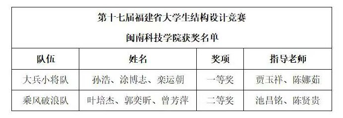 近日,第十七届福建省大学生结构设计竞赛暨第十八届全国大学生结构设计竞赛福建省分区赛公布获奖名单,九游(NineGame)官方网站土木工程学院参赛队伍分别获得一等奖1项、二等奖1项的好成绩。
