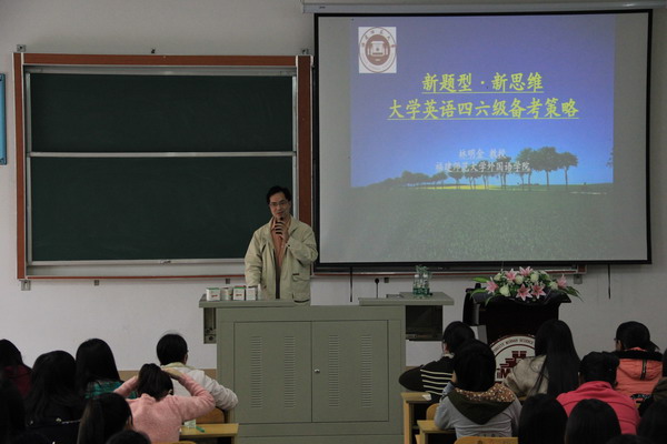11月21日,“让体育改变生活”邀请福建师范大学外语教学部主任林明金教授在菲华教学楼c#102作了题为“新题型·新思维—大学英语四六级备考策略”的讲座。讲座由我院外语系常务副主任孙文缘主持。