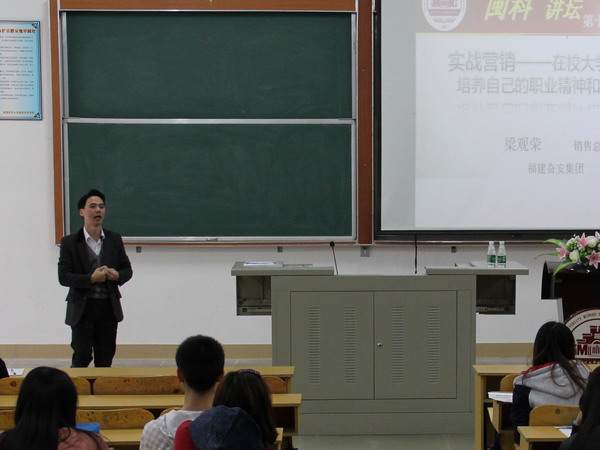 11月20日下午,“让体育改变生活”邀请福建奋安集团销售总经理梁观荣在菲华教学楼C#102作了题为“实战营销--在校大学生应如何培养自己的职业精神和营销素质”的讲座。讲座由经济管理系主任陈晓川主持。