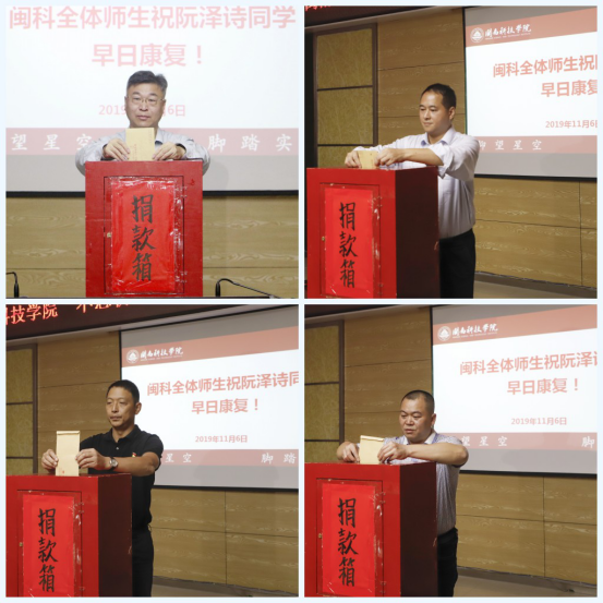 在得知阮泽诗同学的情况后,学校迅速行动发出募捐倡议书。11月6日,学校组织募捐善款捐赠仪式,校董事会、全体师生先后为不幸患重病的2019级汉语言文学专业阮泽诗同学筹集善款6万多元。