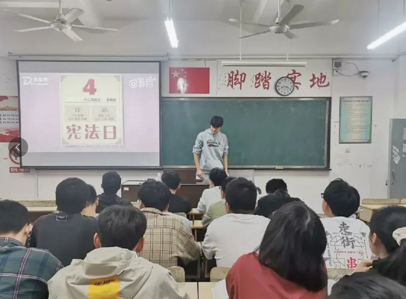 马克思主义学院通过搭建“知识竞赛”“民法典阐释”“听案学法”等实践教学平台,持续打造思政教育特色品牌,在全校各年级专业掀起了“学宪法 讲宪法”学习热潮。