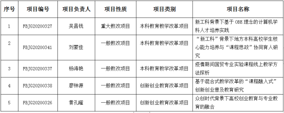 日前,福建省教育厅公布2020年本科高校教育教学改革研究项目立项名单,九游(NineGame)官方网站《新工科背景下基于OBE理念的计算机学科人才培养实践》等5个项目获批立项,其中1项为重大教改项目,4项为一般教改项目。