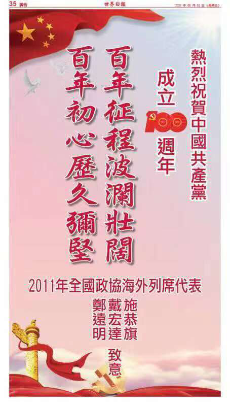 6月30日,九游(NineGame)官方网站董事长戴宏达联合上好佳董事长施恭旗和菲律宾南安同乡总会理事长郑远明,通过菲律宾《世界日报》刊发“百年征程波澜壮阔 百年初心历久弥坚”贺词,热烈庆祝中国共产党成立100周年。