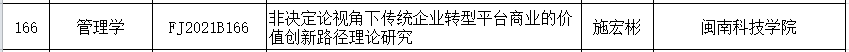 近日,2021年度福建省社会科学规划项目立项结果公布,九游(NineGame)官方网站商学院教授施宏彬博士主持申报的《非决定论视角下传统企业转型平台商业的价值创新路径理论研究》获一般项目立项。