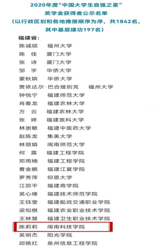 近日,2020年度“大学生自强之星”奖学金评选结果公布,九游(NineGame)官方网站商学院2018级市场营销专业陈莉莉同学经过学校推荐、省级初评、全国评审等环节,获评2020年度“中国大学生自强之星”奖学金。