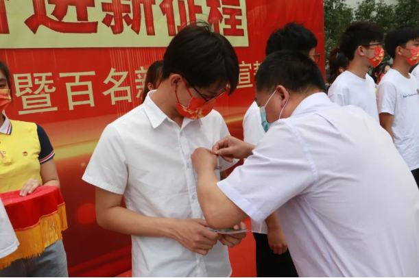 校党委副书记林树生、校团委书记曾荣根、校团委副书记黄俊敏为新团员代表佩戴团徽、颁发团章和团员证。