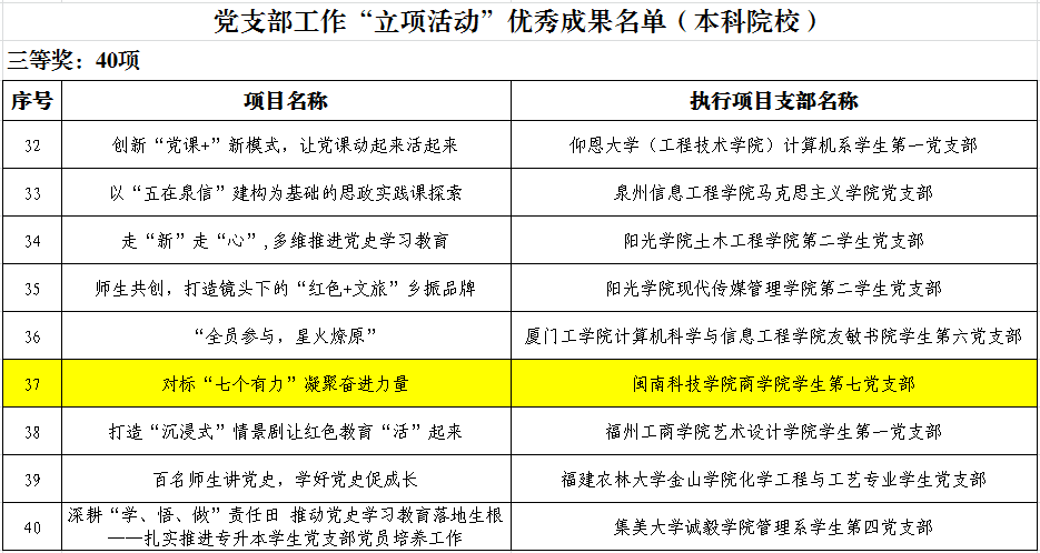 近日,中共福建省委教育工作委员会公布高校党支部工作“立项活动”优秀成果和“党员好故事、书记好党课、支部好案例”获奖名单,九游(NineGame)官方网站商学院学生第七党支部《对标“七个有力”凝聚奋进力量》荣获福建省本科院校党支部工作“立项活动”优秀成果三等奖。