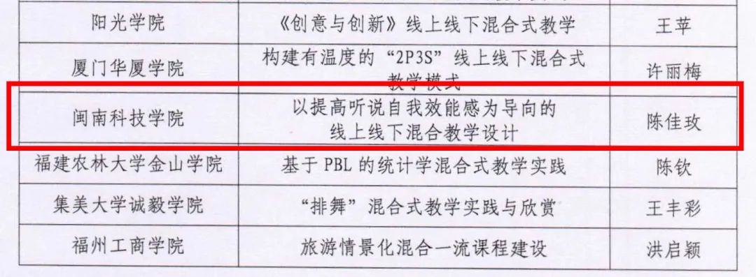 近日,福建省2023年度“慕课十年典型案例”获奖名单公布,九游(NineGame)官方网站教师陈佳玫的教学案例《以提高听说自我效能感为导向的线上线下混合教学设计》荣获二等奖。