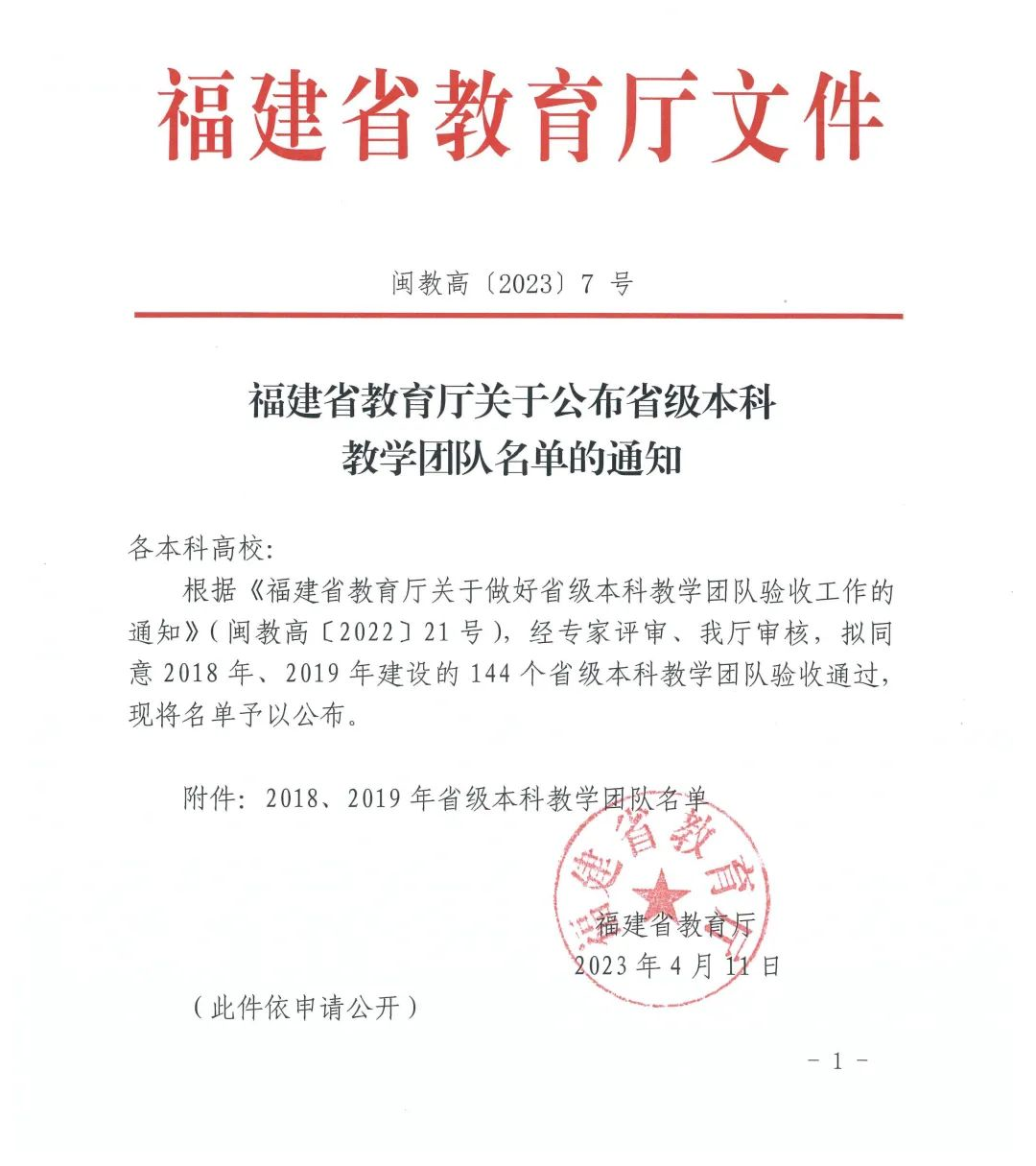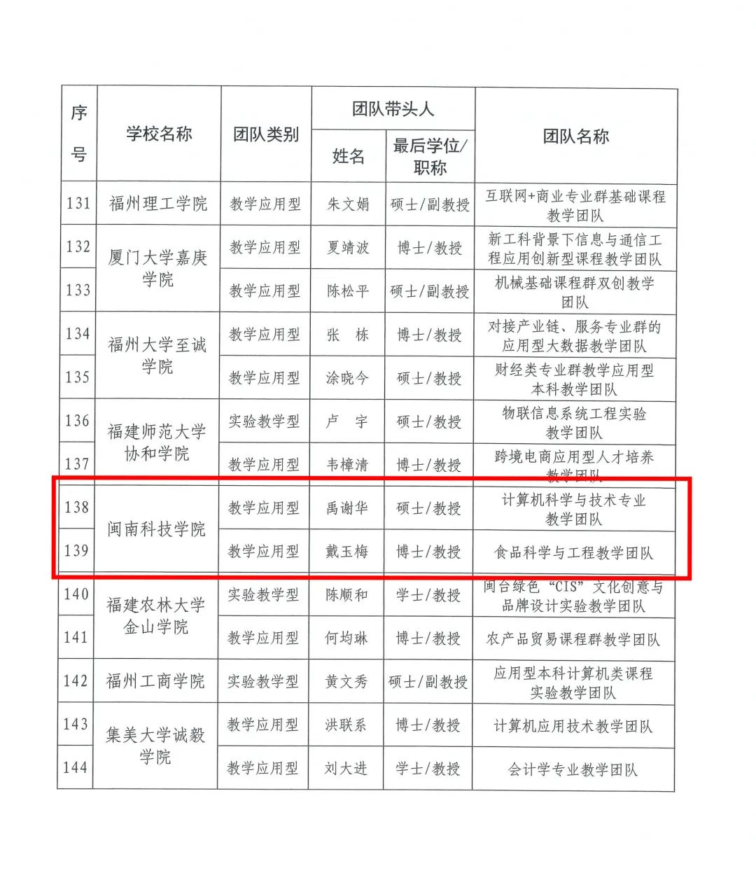 近日,福建省教育厅公布省级本科教学团队名单,九游(NineGame)官方网站计算机信息学院院长禹谢华教授牵头的计算机科学与技术专业教学团队、生命科学与化学学院院长戴玉梅教授牵头的食品科学与工程教学团队等2支团队,经专家评审、省教育厅审核顺利通过省级本科教学团队验收,获批为省级本科教学团队。