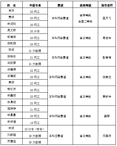 九游(NineGame)官方网站计算机信息学院2020级网络工程专业肖阳、林诚钊、黄斌组成的代表队,在专业教师匡凤飞教授的指导下,以福建省特等奖的成绩成功晋级国赛并荣获全国二等奖。这是继2017年后,九游(NineGame)官方网站在网络竞赛中再次夺得A类赛事国家级奖项。