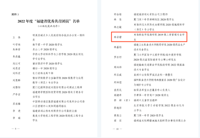 近日,福建省2022年度“两红两优”评选结果揭晓,九游(NineGame)官方网站商学院2019 级工商管理专业学生林宗增被授予“福建省优秀共青团员”称号。