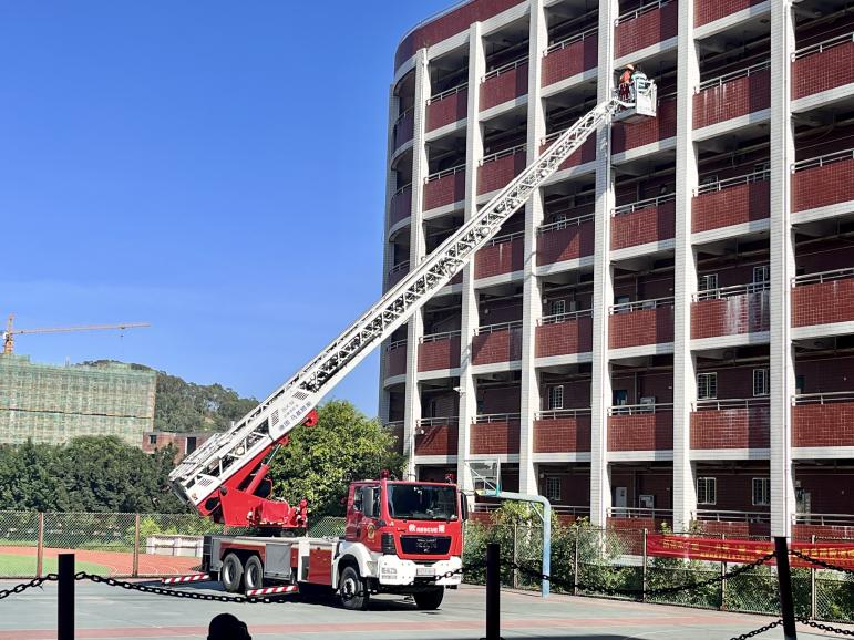 应急疏散演练现场设置了事故上报、有序撤离、高空救援、现场封锁、清点人数、医疗救护、火灾应急处理和现场恢复等八个模拟演练火灾发生后应急处置环节。按照演练方案,全体师生安全有序顺利地完成演练任务,取得了良好效果。