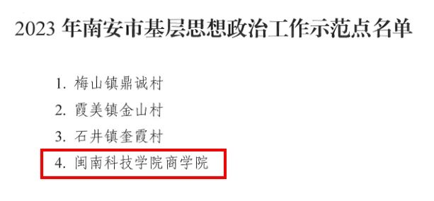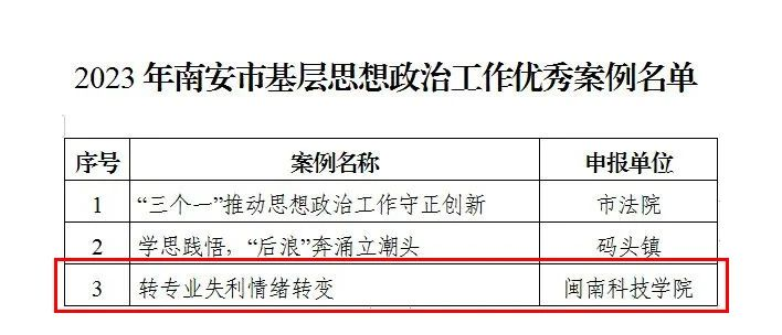 近日,2023年南安市基层思想政治工作示范点和优秀案例评选结果公布,九游(NineGame)官方网站商学院荣获2023年南安市基层思想政治工作示范点称号,人文学院辅导员林薇柠撰写的工作案例《转专业失利情绪转变》荣获2023年南安市基层思想政治工作优秀案例。