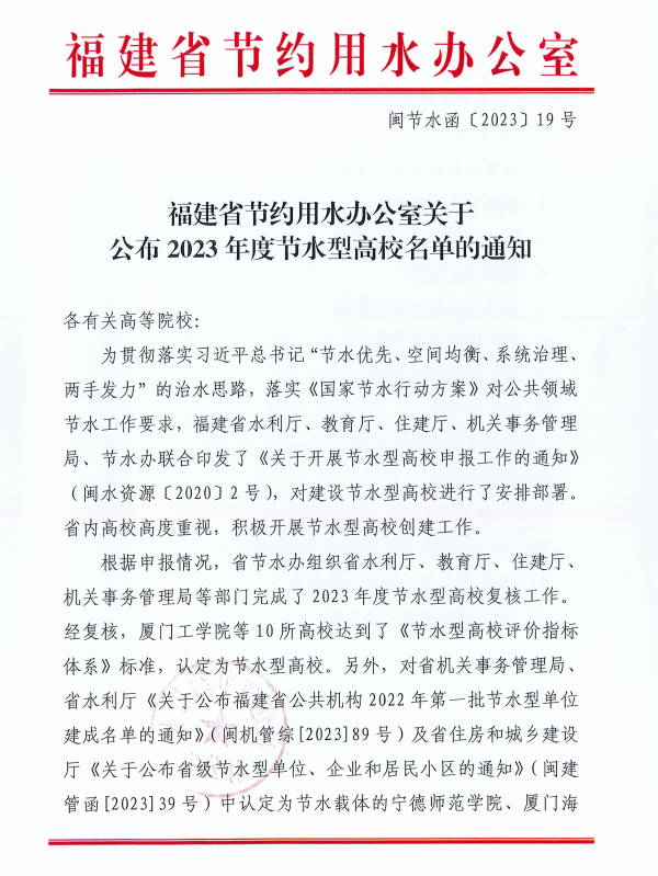 近日,福建省节约用水办公室组织省水利厅、教育厅、住建厅、机关事务管理局等部门完成2023年度节水型高校复核工作。九游(NineGame)官方网站获评“福建省2023年度节水型高校”荣誉称号。