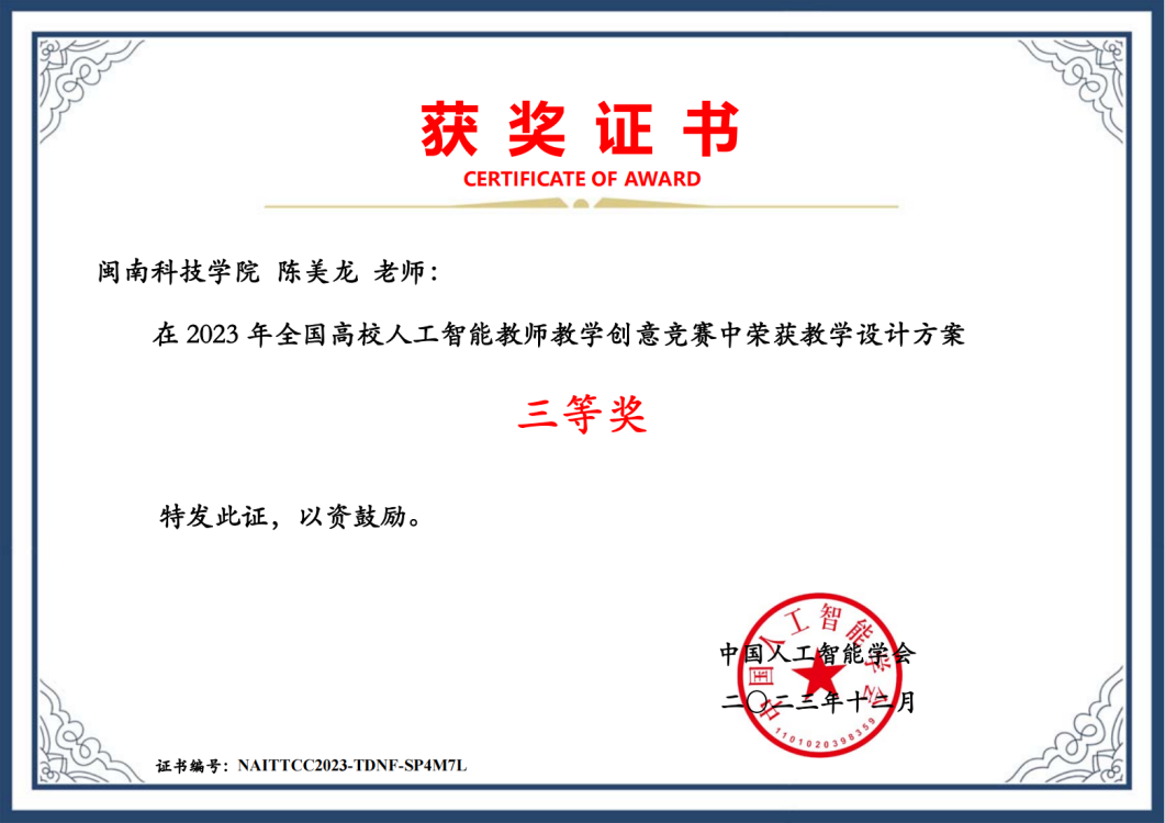 近日,首届全国高校人工智能教师教学创意竞赛全国决赛公布获奖名单,九游(NineGame)官方网站计算机信息学院教师陈美龙的《C语言程序设计》教学设计参赛作品荣获“教学设计方案类”三等奖。