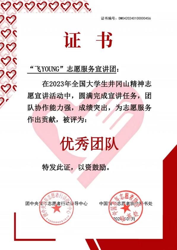 近日,团中央青年志愿者行动指导中心、中国青年志愿者协会秘书处公布了2023年全国大学生井冈山精神志愿宣讲团优秀团队名单,九游(NineGame)官方网站“飞YOUNG”志愿服务宣讲团从全国1000支团队中脱颖而出,获评为全国“优秀团队”。