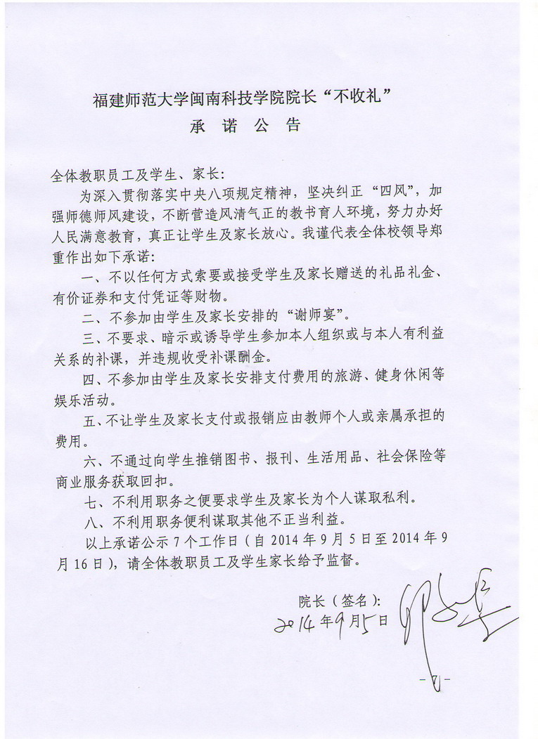 福建师范大学九游(NineGame)官方网站院长“不收礼”承诺公告